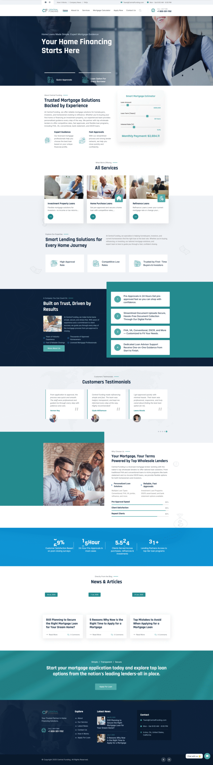 Central Funding is a clean, modern mortgage loan origination platform serving primarily California borrowers. Its responsive design and intuitive interface facilitate easy home loan and refinancing applications. Visitors can start with a pre-qualification process—choosing loan type, entering property and personal details—through a multi-step form to receive personalized rates instantly.Key features include transparent loan options (fixed-rate, FHA, VA, jumbo), integrated mortgage calculators, and a blog for educational content. The website also provides team information, licensed states, and optimized SEO structure to help clients find relevant local mortgage solutions easily