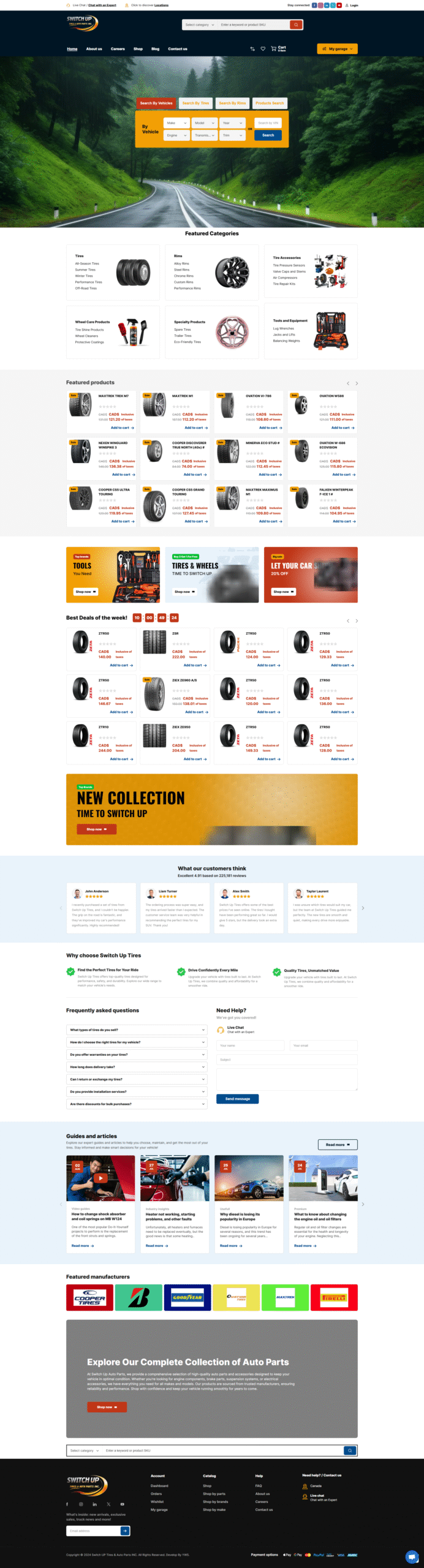 Switch Up Tires is a professional eCommerce website built to sell new and used tires directly to consumers across Canada. Developed by YWS Technologies using WordPress and Elementor Pro, the platform provides a clean, fast, and user-friendly shopping experience tailored specifically for tire buyers.